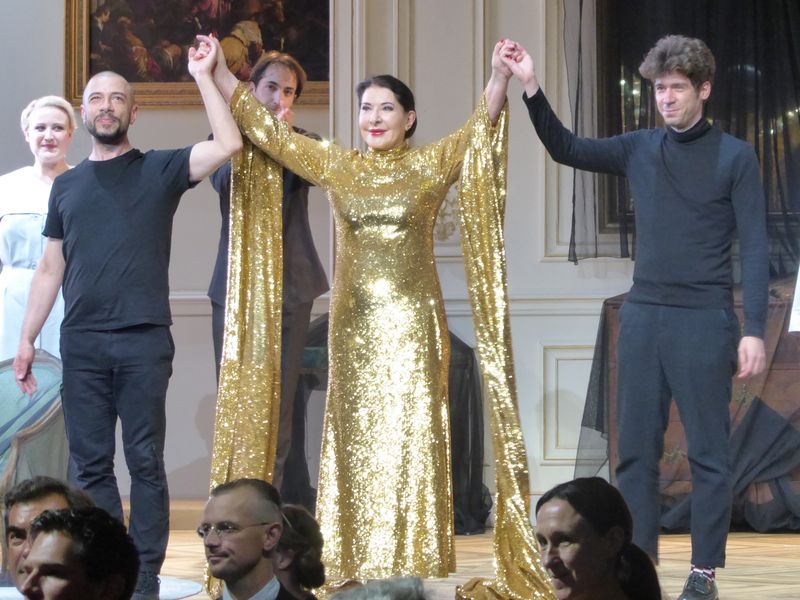 Die stramme Abramovic lag 1 ¼ Stunden geschlossenen Auges und zugedeckt im Sterbe(?)-Bett (der Callas?). Doch war sie, im Verein mit US-Mimen Willem Defoe, in den 8 Video-Szenen voll da: im Astronauten-Look, im Goldlamee-Schwenker, halbnackt, als Torero, in Hochzeits-Weiß gehüllt, mit lebenden Boas um den Hals oder blutbefleckt, stets theatralischen Blicks. Wandspiegel zerschlagend, Blumensträuße zerfetzend. All sowas nicht unbedingt konform mit den Opern-Arien, respektabel gut gesungen von jungen Inhaberinnen von Callas-Rollen (Desdemona fällt da aber weg), die in Altenpflegerinnen-Outfit an ihr Bett schlichen. Aus Angst vor den von Orkanen getriebenen Wolkengebilden auf der Leinwand?