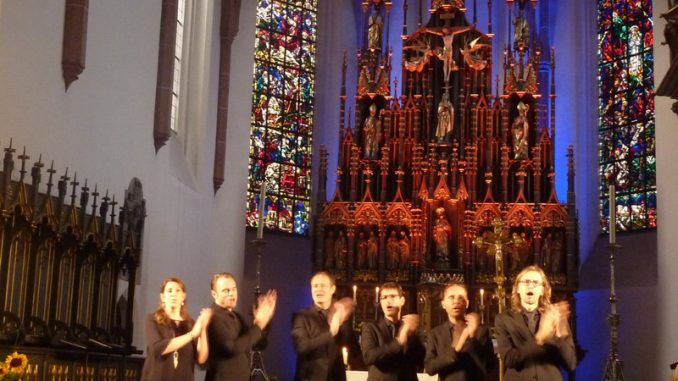 Zu weinen gab es beileibe nichts. Vielmehr zu lachen – über Volkslied-Arrangements mit Norbert Ochmanns pfiffigem Schneider Meckmeckmeck-Gesang und Wolf Kerscheks wild-grauslichem Hexen-Locken für Hänsel und Gretel. Selbst bei so tragischen Romanzen vom König in Thule und „Darthulas Grabgesang“, für den Brahms triste Töne fand, war alles reinstes Hörerglück. Grund: Kristallklarer Klang. Wie aus einer Kehle. Wie aus einem Guss. Ein einziges Klangwunder. Applaus pur für SINGER PUR. Kaum zu toppen diese grundmusikalischen Leute: Claudia Reinhard, Rüdiger Ballhorn, Markus Zapp, Manuel Warwitz, Reiner Schneider-Waterberg (dem knappe Kommentare zu danken sind) und Marcus Schmidl, der sich aufs Singen ebenso wie aufs Arrangieren versteht.