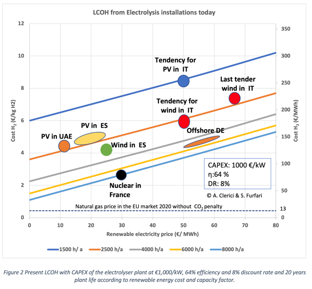 Die EU-Kommission plant in ihrer „Wasserstoff-Strategie für ein klimaneutrales Europa“ zwischen 2025 und 2030 den Aufbau von Kapazitäten für grünen Wasserstoff in der Größenordnung von 10 Millionen Jahrestonnen. Dafür brauche man eine Elektrolyse-Kapazität von 40 Gigawatt (GW), erklärt die EU-Kommission. Clerici und Furfari haben nachgerechnet und kommen stattdessen auf 50 GW. Überdies konnten die beiden Ingenieure nachweisen, dass die EU-Kommission bzw. ihre grünen Berater mit einer unerreichbar hohen Effizienz der Elektrolyse-Anlagen gerechnet haben. Um mit 50 GW 10 Mio. Tonnen (oder 333 TWh) H2 zu erzeugen, müssten die von Windrädern und Fotovoltaik gespeisten Anlagen 8.760 Stunden im Jahr laufen. Realistisch seien aber auf der Basis der Zahlen von Eurostat im europäischen Schnitt nur 2.050 Stunden für Windräder und 1.150 Stunden für Solarpanele. Deshalb brauche man in der EU 157 GW zusätzliche Windkraft-Kapazitäten und 105 GW zusätzliche Photovoltaik-Kapazitäten, um die Ziele der Kommission zu erreichen. Insofern erscheint realistisch, was der Chef des Industriegase-Konzerns Linde, Wolfgang Reitzle, kürzlich vorrechnete: Um die Forderungen der Grünen in Sachen Erneuerbare Energien und grünem Wasserstoff eins zu eins umzusetzen, brauche man allein in Deutschland über 300.000 Windräder. Dafür reicht der Platz nicht aus. Dr.-Ing. Erhard Beppler hat das vor kurzem hier bestätigt.