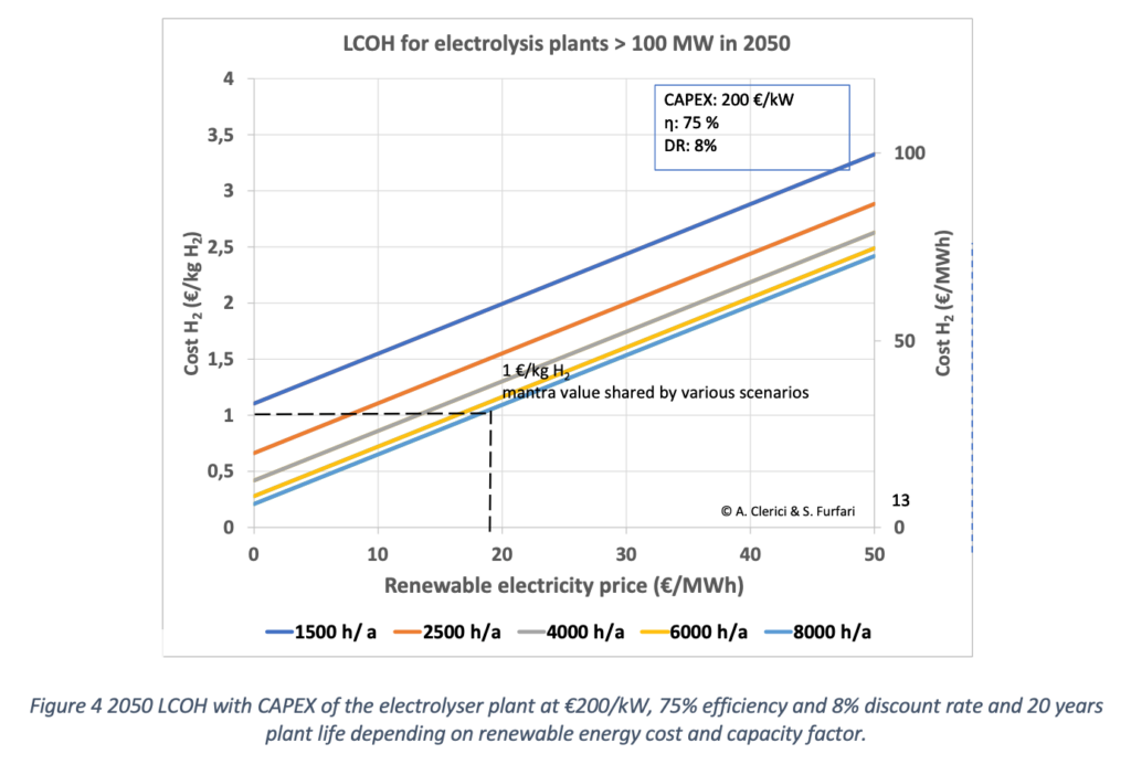Clerici und Furfari halten sich in ihrer Kostenschätzung der Produktion von grünem Wasserstoff an die Vorgaben der Internationalen Energie-Agentur (IEA). Zurzeit kostet grüner Wasserstoff bis zum 17-Fachen des Marktpreises von Methan (ohne CO2-Steuer). Dieser lag im vergangenen Jahr im EU-Durchschnitt bei 13€/MWh. Die obige Abbildung zeigt die Ausgangslage, das unten stehende Bild die „offizielle“ Zielprojektion. Die EU-Kommission „verspricht“ bis zum Jahre 2050 einen Selbstkostenpreis für grünen Wasserstoff von einem Euro je Kilo. Erreichbar sei das nur bei einem CO2-Preis von mindestens 100 Euro je Tonne, betonen Clerici und Furfari. Sie halten einen solch hohen CO2-Preis in einer globalisierten Welt aber nicht für durchsetzbar, zumal die Einführung der von der EU-Kommission geforderten „Carbon Border Tax“ zum Schutz des durch den „Green Deal“ der EU verteuerten Lebens von 450 Millionen Europäern gegen außereuropäische Konkurrenz bei Fachleuten als illusorisch gilt.