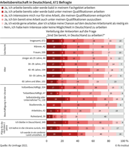 Die Umfrage des ifo Instituts lief vom 23. Mai bis zum 6. Juni 2022. Die Befragten wurden hauptsächlich über die sozialen Medien angesprochen. Zusätzlich wurden Geflüchtete in München und Umgebung persönlich interviewt. Weil es bislang keine allgemeinen Daten zu den Geflüchteten gibt, kann die Umfrage auch nicht repräsentativ sein.