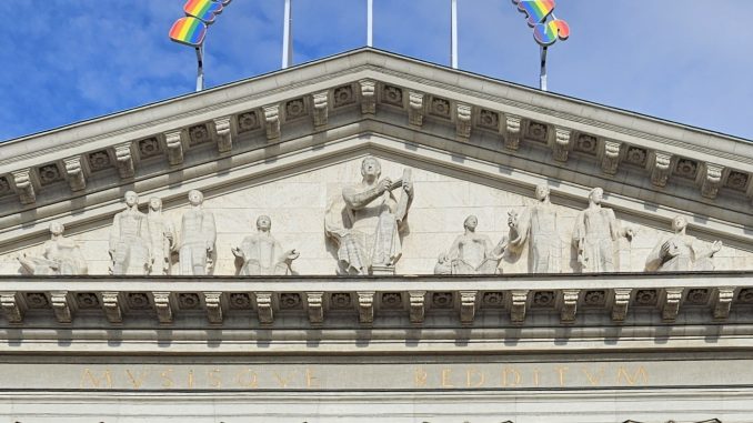 „Dreams and Dramas“ steht in Leuchtschrift auf dem Halbbogen über der Fassade des Münchner Nationaltheaters – künstlerische Zugabe für die Zeit der 150. Münchner Opernfestspiele, Foto: Hans Gärtner