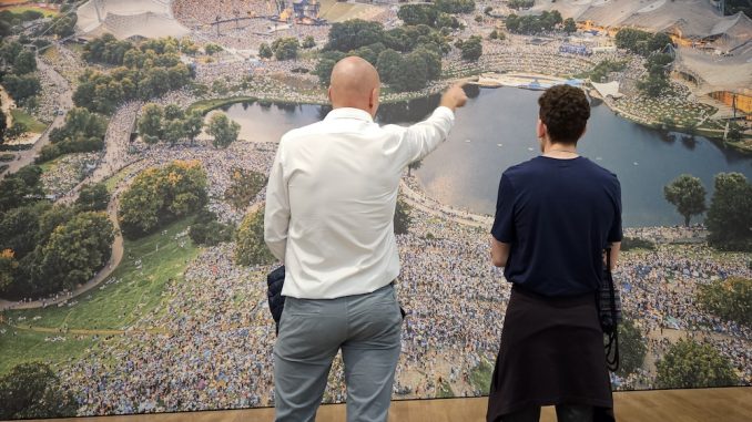 Ein guter Rat: Man beginne in der Abteilung „Fließen“, wo unter anderem das von jugendlichen Besuchern umstellte Foto mit vielen Kindern hängt, die auf einem „Wild River“ in dick aufgeblasenen Pneus schippern und lustig einen Urwald durchqueren. Doch man versäume nicht, auch das Foto zu sehen, das unmittelbar mit München zu tun hat. Es nimmt die ganze große Wand eines der letzten zu betretenden Räume ein. Der bekannte Fotograf Manuel Picker ist der Autor dieser Luftaufnahme im Olympia-Zentrum. Es ist am 27. Juli vergangenes Jahr entstanden, als Hunderte von vor allem jungen Menschen das umjubelte Münchner „Eras Tour“-Konzert von Popsuperstar Taylor Swift besuchten. Die beiden Männer, die sich, wie es scheint, von dem Riesenfoto nicht trennen können, sind vielleicht gerade dabei, darauf sich selbst in der Menschenmenge zu entdecken. – Bis 24. August täglich 10 – 20 Uhr.