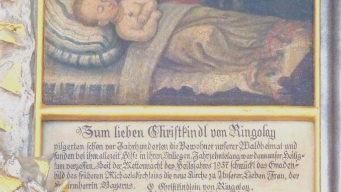 Mit dem Wallfahrts-Bild hat es eine eigene Bewandtnis. Es ist kein Original, sondern eine Kopie. Angeblich nahm der von Oliver Cromwell verfolgte Walter Lynch, Bischof von Confert in Irland, 1649 das Bild nach Wien mit. Bischof Janos Püsky brachte es nach Raab, das heutige Györ in Ungarn. Am St. Patrick-Tag 1697 flossen drei Stunden lang blutige Tränen aus den Augen der gemalten Gottesmutter. Anlass genug, um eine Wallfahrt zu installieren. Die Raaber Kopie gelangte ins Fürstbistum Passau. Hier hatte ein Jakob von Urleinsberg 1698 eine Marien-Bruderschaft gegründet, der er wohl die Kopie vermachte. Als gesichert gilt: Der Ringelaier Pfarrer fand sie 1917 auf dem Dachboden der Kirche und ließ sie restaurieren. „Seit der Mettennacht des Heilsjahres 1937 schmückt das Gnadenbild des früheren Michaelikirchleins die Kirche zu Unserer lieben Frau, der Schirmherrin Bayerns“. So steht unter dem Wallfahrtsbild mit der die Hände faltenden Muttergottes und dem vor ihr mit geschlossenen Augen schlafenden Jesuskind.