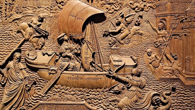Das Thema „Schiff als Metapher und Symbol“ ließen sich die kräftig in die Depots und glückvoll auf so manche wichtige Leihgeber (zurück)greifenden Ausstellungsmacher nicht entgehen. So stellen sie etwa eine Nürnberger Buchillustration von 1587 mit einer von Narren besetzten Karavelle in eine Vitrine zur Freude des Betrachters aus, um zu belegen: So sieht der Staat aus: ein führungsloses Gemeinwesen, in dem Spaßmacher das Sagen haben, unter denen man dem Untergang entgegen rudert. Aus der Werkstatt des Hamburgers Jakob Moves d. Ä. stammt die gut vier Jahrhunderte alte Federzeichnung eines Schiffspokals mit den Figuren von Fortuna (Glück) und der Spes (Hoffnung). Der Würzburger Schnitzer Peter Dell schuf 1534 ein beeindruckendes Relief aus Ahornholz. Darauf steht links der Apostel Paulus, rechts der Auferstandene und dazwischen jede Menge „Teufelszeug“ und Höllenpersonal. In den eingravierten kurzen Aufschriften geht es um die protestantische Gnadenlehre. Die christliche Seele fährt Schifferl. Sie trotzt ihrer mannigfachen Gefährdung und strebt dem Himmel entgegen: „Tod, wo ist dein Stachel, Hölle, wo ist dein Sieg!“