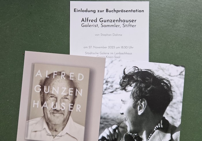 Buch-Cover und Einladung des Münchner Lenbachhauses, dazu ein Jugend-foto des Galeristen und Kunstsammlers Alfred Gunzenhauser, Foto: Hans Gärtner