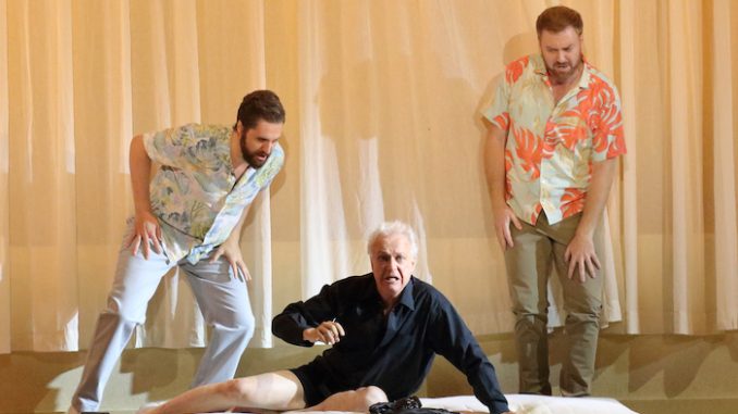 Als Don Alfonso agierte herrlich infam und heuchlerisch Johannes Martin Kränzle, als die beiden Schwestern warfen sich Louise Alder und Avery Amereau ins Zeug, Guilelmo (Konstantin Krimmel) und Ferrando (Bogdan Volkov) glänzten akrobatisch nicht weniger als stimmlich, und Sandrene Piau ist als herrliche Rampensau-Despina kaum ersetzbar. Ideale, großartige Protagonisten. Prächtiges Horn. Verlässliche kleine Chöre in den Logen. Unterm Strich hat`s gefallen, auch wenn sich manch verzogener Mundwinkel zeigte, der Dieter Dorns chicer, gesitteter, langlebiger Inszenierung vor 30 Jahren im gleichen Haus nachtrauern mag.