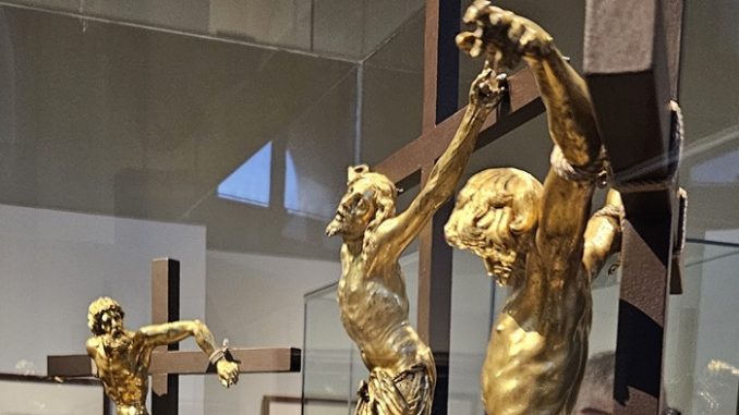 Der am Kreuz sein Leben aushauchende Gottessohn und die ihn flankierenden Mitverurteilten – diese Szene kennt man: zur Linken der Christus zugeneigte, bußfertige, zur Rechten der sich von Christus abwendende unbußfertige Schächer. Vielfach haben bildende Künstler den „Kalvarienberg“ gestaltet. Zu ihnen zählt, an allererster Stelle, ein oberbayerischer Bildhauer, in Weilheim 1601 oder 1602 geboren, nach nur 33 Lebensjahren, Christus ähnlich, in Augsburg gestorbene Georg Petel. Kaum einer seiner Zeitgenossen verstand sich auf die Elfenbeinschnitzerei so gut wie er. Nicht umsonst galt er als der deutsche Michelangelo. Noch keine 22, schuf er einen am Kreuz sterbenden Christus aus Elfenbein, der ihn bereits damals schon weltberühmt machte.