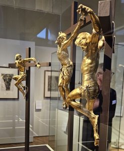 Aber nicht um diese Figur, sondern um die Vorgaben für eine dreiteilige Kreuzigungsgruppe aus vergoldeter Bronze geht es in der neuesten Studienausstellung des Bayerischen Nationalmuseums „Goldene Passion“, entstanden 1625/26 in Augsburg, wo sich Petel, nach Wanderjahren in die Niederlande zu Peter Paul Rubens, nach Paris und Rom niedergelassen und verheiratet hatte. Diese Kreuzigungsgruppe ist nun erstmals, nachdem sie jahrzehntelang getrennt war, in München vereint. Hier lag der Kruzifixus im Depot, die beiden Schächer aber befanden sich im Berliner Bode-Museum. „Aufgrund ihrer dynamischen Konzeption und der meisterhaften Wiedergabe ihrer Anatomie“ zählte man sie schon immer zu Petels „vorbildhaften Werken“. Beweise hierfür lieferten „nicht zuletzt die vielen Kopien, die bis zum Ende des 18. Jahrhunderts entstanden. Mit den Schächern“, so der Petel-Forscher Jens Ludwig Burk, habe sich „bis heute das Rätsel der verlorengeglaubten Christusfigur“ verbunden.