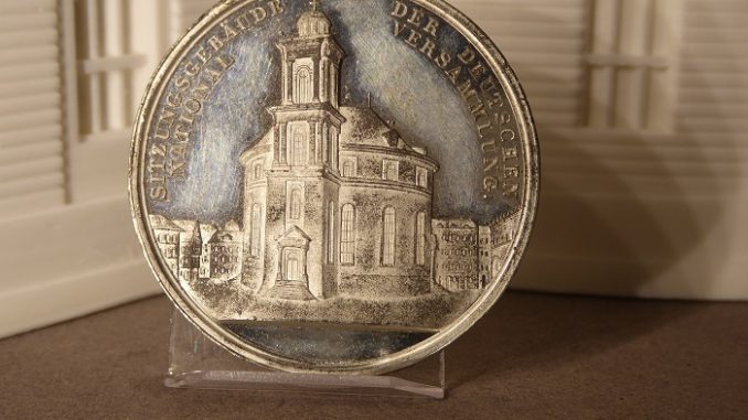 Vor das possierliche Paulskirche-Modell im Glaskasten wurde eine Medaille des Jahres 1848 auf die Wahl von Erzherzog Johann (1782 bis 1859) zum Reichsverweser platziert. Sein Brustbild in Generalsuniform mit Ordensband und zwei Ordenssternen, dazu die Insignien des Ordens vom Goldenen Vlies, ziert die Schauseite. Zu sehen ist aber die Rückseite des kreisrunden Zinngusses mit in zwei Bögen gesetzter Umschrift „Sitzungsgebäude – der Deutschen / National-Versammlung“, hergestellt wurde bei A. Neuss in Augsburg.