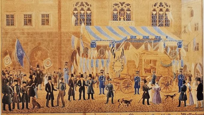 Am 8. August 1842 schickte die Redaktion des „Bayerischen Eilboten“ ihren Kultur-Reporter in die „gemüthliche Halbinselstadt“ Wasserburg am Inn. Ein großes Ereignis stand bevor: 51 Jahre nach seinem Tod sollte Wolfgang Amadé Mozart vor dem Rathaus in besonderer Weise gehuldigt werden. Ein für Salzburg bestimmtes Bronzedenkmal wurde durch die Stadt geführt, in der der damals 7-jährige Bub zwei Tage unfreiwillig verbrachte.