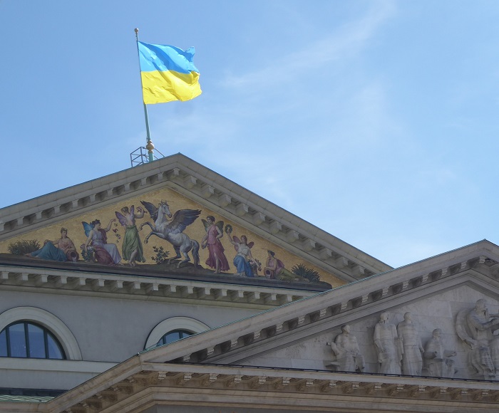 Beflaggt für die „Teufel“-Serie der Staatsoper mit dem Gelb-Blau der von Putin ungezügelt weiter vernichteten Ukraine: das Münchner Nationaltheater, Foto: Hans Gärtner