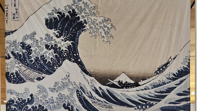 Entschädigung bietet dann doch die riesenhafte Vergrößerung der „Welle“ auf einem Wandbehang im Marmorsaal. Aber auch eine Video-Station „The Printing Process of Japanese Woodblock Prints“. Da wird das Druckverfahren des Japanischen Farbholzschnitts der Edo-Zeit gezeigt, der zu den „Bildern der fließenden Welt“ (ukiyo-e) gerechnet wird. Der Künstler ist bekannt: Katsushika Hokusai (1760 – 1849). Die geforderten sieben Minuten Zeit sollte man sich nehmen, um die Technik des japanischen Holzschnittes nicht nur kennen, sondern auch schätzen zu lernen. Es handelt sich ja hierbei um eine Ikone der Kunst. „Erst auf den zweiten Blick sind kleine Boote zu sehen, von Wind und Wellen hin und her geworfen. In einem starken Kontrast zu diesem dynamischen Geschehen im Vordergrund steht der Hintergrund: Hier ruht der heilige Berg Fuji, entrückt und majestätisch“.