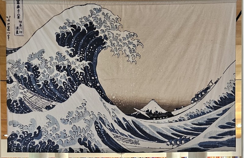 Vergrößerter Holzschnitt als Wandbehang: „Unter der Welle im Meer vor Kanagawa“, bekannt als „Große Welle“ (1830/32), Foto: Hans Gärtner.
