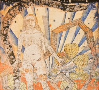 Vor der Tapisserie „Eva“ kommt der in Sachen Kiki Smith von M nach FS Pendelnde kaum los. Ganz allein und breitbeinig, die Arme von sich gestreckt, die Finger beider Hände gespreizt, steht die splitternackte Urmutter der Schöpfungsgeschichte vor dem Betrachter. Nichts, kein Blatt, kein Stück Holz schützt ihren Schoß. Sie ist eher ältlich als – wie gewohnt – jung und attraktiv. Ihr Gesicht könnte auch einem Mann gehören. Sie tritt nicht auf die Schlange, wie Maria, die Mutter Jesu es auf so vielen traditionellen Bildern tut, um diesem Urtier den Kopf zu zertreten. Die Schlange ragt seitlich links an Evas Gestalt empor, um ihr zum Dach zu werden. Worauf Eva mit beiden Füßen steht, ist ein sich eckig windender langer Baumteil. Dreiblättriger Riesenklee in zartem Grün wächst vor einer mit Sternen bestückten Gloriole, die in Hellgelb und Hellblau strahlt. Paradiesisch. Aber: Wo ist Adam?