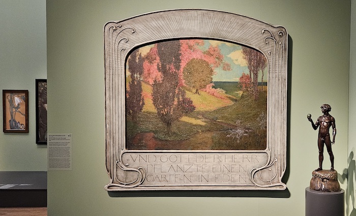 Mitte: Richard Riemerschmid: „Garten Eden“, 1900. Rechts: Hermann Kahn: „Adam“, Bronze, 1895. Links: Elisabeth Erber: „Blattstängel mit 3 Nachtfaltern“, Pastell auf Karton, 1899. Foto: Hans Gärtner