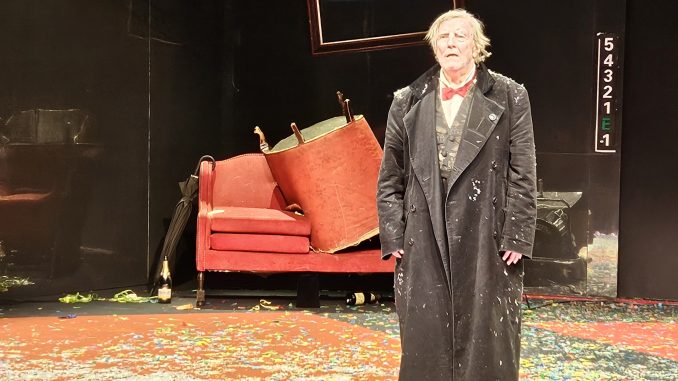 Um diese im hohen Alter noch einmal zu geben, erwartet der Greis seinen Schulkameraden, den Flensburger Schauspieldirektor, im Foyer eines  schäbigen Hotels in Oostende. Wo er mit einem Kastenkoffer bei Schneesturm anlangte, in den er seinen Ruhm als Darsteller-Star in Form von Zeitungskritiken gepackt hat, samt der Maske für den irren Lear, verfertigt von James Ensor persönlich. Die von Barbara Melzl dappig gemimte Dame im Foyer, es ist Silvesterabend, hält sich ans Champagnerglas, das nachzufüllen sie den Portier (Mauro Nieswandt) anmacht den Lohndiener bittet, das Gesüff (Pujan Sadri) ihr aufs Zimmer liefern, wenn dieser mal nicht das vom hohen Schreibpult mehrmals fallende Gästebuch hinaufreichen muss.