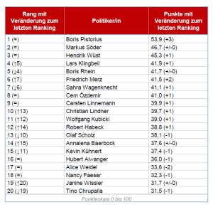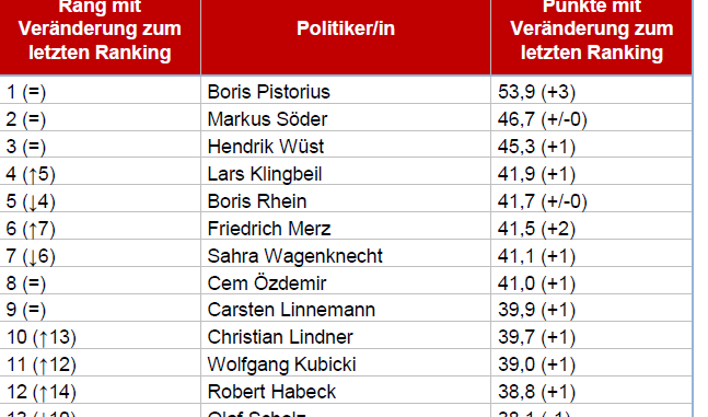 Das aktuelle Politikerranking wird in dieser Woche unverändert vom Verteidigungsminister Boris Pistorius angeführt (53,9 Punkte, +3). Auf Platz zwei folgt Markus Söder mit 46,7 Punkten (+/-0) und die Top drei, die auch in dieser Woche unverändert geblieben sind, vervollständigt Hendrik Wüst mit 45,3 Punkten (+1). Darauf folgt Lars Klingbeil, welcher sich um einen Rang verbessert (41,9 Punkte, +1) und Boris Rhein mit 41,7 Punkte (+/-0), welcher wiederum vom Platz vier auf fünf abrutscht. Auch Friedrich Merz (41,5 Punkte, +2) und Sahra Wagenknecht (41,1 Punkte, +1) tauschen sich die Plätze (Rang 6 bzw. 7). Darauf folgen jeweils unverändert Cem Özdemir (Rang 8; 41,0 Punkte, +1) und Carsten Linnemann (Rang 9; 39,9 Punkte, +1). Weiter verbessert sich Christian Lindner (39,7 Punkte, +1) vom Rang 13 auf zehn, Wolfgang Kubicki (39 Punkte, +1) vom Rang zwölf auf elf und Robert Habeck (38,8 Punkte, +1) vom Rang 14 auf zwölf. Olaf Scholz (38,1 Punkte, -1) verschlechtert sich hingegen um drei Positionen und landet somit auf Platz 13. Annalena Baerbock (37,6 Punkte, +/-0) verbessert sich trotz unveränderter Punktzahl um einen Rang und besetzt entsprechend Rang 14. Kevin Kühnert (37,4 Punkte, -1) rutscht in dieser Woche von Platz elf auf 15 ab. Hubert Aiwanger (Rang 16; 36 Punkte, -1), Alice Weidel (Rang 17; 33,6 Punkte, -2) und Nancy Faeser (Rang 18; 32,3 Punkte, -1) behalten jeweils die Plätze der Vorwoche. Janine Wissler (Rang 19; 31,7 Punkte, +/-0) und Tino Chrupalla (Rang 20; 31,5 Punkte, -1) tauschen hingegen die Plätze, bleiben aber nach wie vor am wenigsten beliebt.