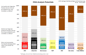 Den Anteil an potentiellen Wählern können die SPD sowie die Union jeweils um einen und die AfD um zwei Prozentpunkte erhöhen. Die Grünen sowie die FDP verlieren hier jeweils einen Prozentpunkt. Die Potentiale der Linkspartei sowie der Freien Wähler verändern sich nicht.