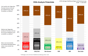 Bei den potentiellen Wählern kann die AfD zwei und die Union drei Prozentpunkte hinzugewinnen. Die SPD verliert hingegen einen Prozentpunkt. Die Potentiale der restlichen Parteien bleiben jeweils unverändert.