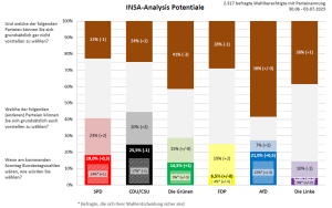 Bei den potentiellen Wählern verliert die Linkspartei einen Prozentpunkt. Die AfD gewinnt hingegen einen hinzu und die SPD, die Union sowie die FDP verzeichnen hier sogar jeweils zwei Prozentpunkte an Zugewinn. Das Potential der Grünen bleibt konstant.