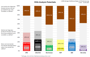 Bei den potentiellen Wählern kann in dieser Woche einzig die SPD zwei Prozentpunkte hinzugewinnen. Die Union verliert hingegen zwei, die Grünen, die AfD sowie die Linke jeweils drei Prozentpunkte. Das Potential der FDP bleibt stabil.