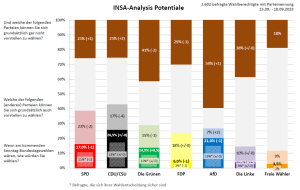 Bei den potentiellen Wählern kann einzig die AfD zwei Prozentpunkte hinzugewinnen. Die Grünen verlieren dagegen einen, die SPD zwei und die Union sogar vier Prozentpunkte. Die Potentiale von FDP und Linkspartei verändern sich nicht. Die Freien Wähler ordnen sich bei den potentiell gewinnbaren Wählern derzeit bei neun Prozent ein.