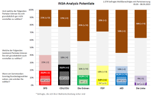 Bei den potentiellen Wählern kann einzig die AfD zwei Prozentpunkte hinzugewinnen. Die Linkspartei verliert hingegen einen, die SPD zwei und die Union sogar vier Prozentpunkte. Sowohl das Potential der Grünen als auch der FDP bleibt jeweils konstant.