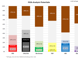 Den Anteil an potentiellen Wählern kann die FDP um vier Prozentpunkte erhöhen. Auch die Union legt hier zwei und SPD, Grüne und AfD jeweils einen Prozentpunkt zu. Die Linkspartei bleibt bei den potentiellen Wählern konstant.