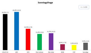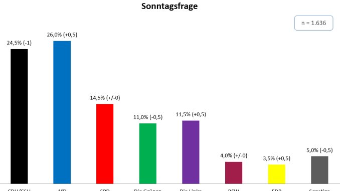 Die AfD gewinnt in dieser Woche einen halben Prozentpunkt und führt somit zum ersten Mal Potentialanalyse mit 26 Prozent vor der Union mit 24,5 Prozent, welche einen Prozentpunkt einbüßt, an. Darauf folgt die SPD mit unveränderten 14,5 Prozent, die Linke mit 11,5 Prozent (+0,5) und die Grünen mit elf Prozent (-0,5). Sowohl das BSW (4 %, +/-0) als auch die FDP (3,5 %, +0,5) erreichen lediglich einstellige Werte.