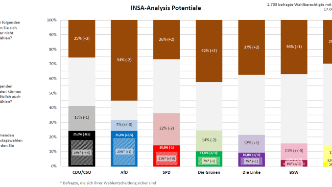 Auch bei den potentiell erreichbaren Wählern legt die Linke einen Prozentpunkt zu, wohingegen hier die Union einen und die SPD, die Grünen sowie die FDP zwei Prozentpunkte einbüßen. Die Potentiale der AfD sowie des BSW bleiben jeweils konstant.