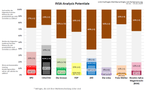 Den Anteil an potentiellen Wählern können sowohl die FDP als auch die Linke jeweils um einen und das BSW um zwei Prozentpunkte erhöhen. Die SPD, die Union, die AfD sowie die Freien Wähler verlieren hier jeweils einen Prozentpunkt. Einzig das Potential der Grünen bleibt konstant.