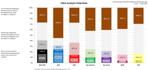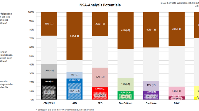 Bei den potentiell erreichbaren Wählern können sowohl Union als auch FDP einen Prozentpunkt zulegen, während die AfD, die Grünen sowie das BSW jeweils einen, die Linke zwei und die SPD drei Punkte verlieren.