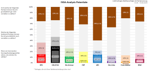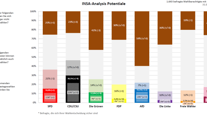 Die CDU/CSU (30,5 %) bleibt in dieser Woche unverändert, führt aber nach wie vor die aktuelle Potentialanalyse mit einem deutlichen Vorsprung an. Dahinter folgt die SPD mit 16 Prozent, die einen Prozentpunkt hinzugewinnt, die AfD mit 15,5 Prozent, welche anderthalb Prozentpunkte verliert, und die Grünen mit zwölf Prozent, die ihren Vorwochenwert behalten. Die anderen Parteien kommen lediglich auf einstellige Werte: das BSW auf 7,5 (+ 0,5), die FDP auf fünf (+/- 0), die Linkspartei auf 3,5 (+ 0,5) und die Freien Wähler auf 2,5 Prozent (+/- 0).