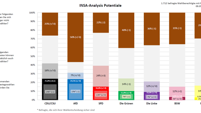 Bei den potentiell erreichbaren Wählern legt das BSW sowie die FDP jeweils einen und die SPD drei Prozentpunkte zu, wohingegen hier die Grünen einen Prozentpunkt einbüßen. Die Potentiale der Union, der AfD sowie der Linkspartei bleiben unverändert.