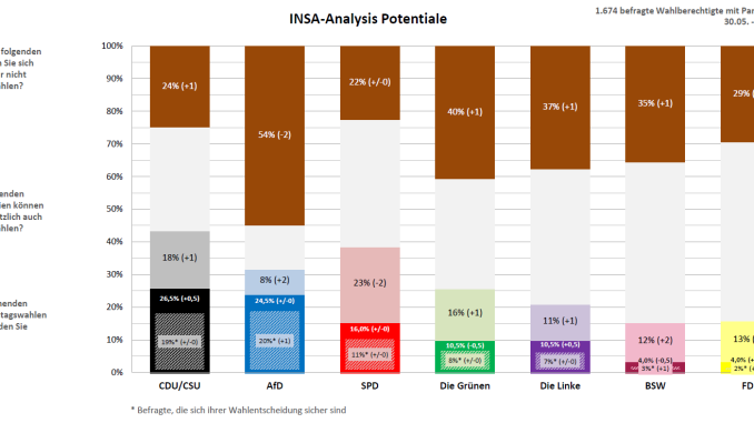 Sowohl die Union als auch die Grünen, die Linke sowie die FDP gewinnen bei den potentiell erreichbaren Wählern jeweils einen Prozentpunkt und die AfD sowie das BSW jeweils zwei Prozentpunkte hinzu, wohingegen die SPD hier zwei Prozentpunkte verliert.