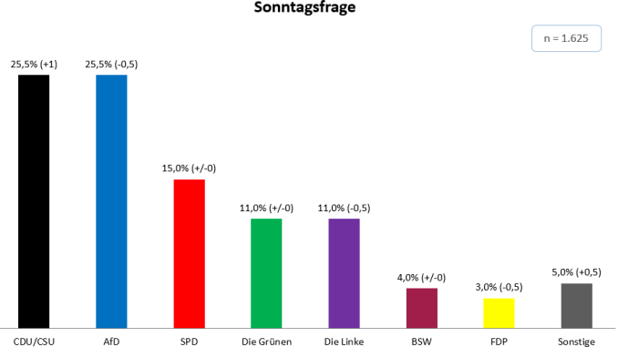 Die Union gewinnt in dieser Woche einen Prozentpunkt hinzu, während die AfD einen halben Prozentpunkt einbüßt, somit erreichen die beiden Parteien wieder den Gleichstand von je 25,5 Prozent. Dahinter folgt die SPD mit unveränderten 15 Prozent. Auch die Grünen behalten ihren Vorwochenwert von elf Prozent bei, während die Linke einen halben Prozentpunkt verliert und ebenfalls bei elf Prozent landet. Das BSW (4 %) bleibt konstant und die FDP (3 %) verliert einen halben Prozentpunkt. Fünf Prozent (+0,5) entfallen diese Woche auf sonstige Parteien.