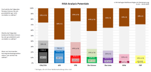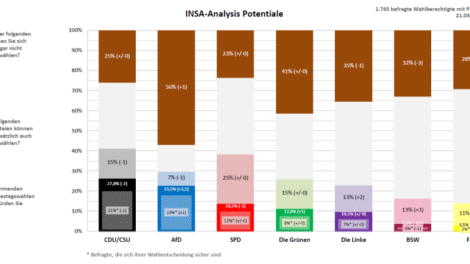 Bei den potentiell erreichbaren Wählern legt die Linke zwei und das BSW sogar drei Prozentpunkte zu, wohingegen hier die AfD sowie die Union jeweils einen Prozentpunkt einbüßen. Sowohl das Potential der SPD als auch der Grünen und der FDP bleibt konstant.