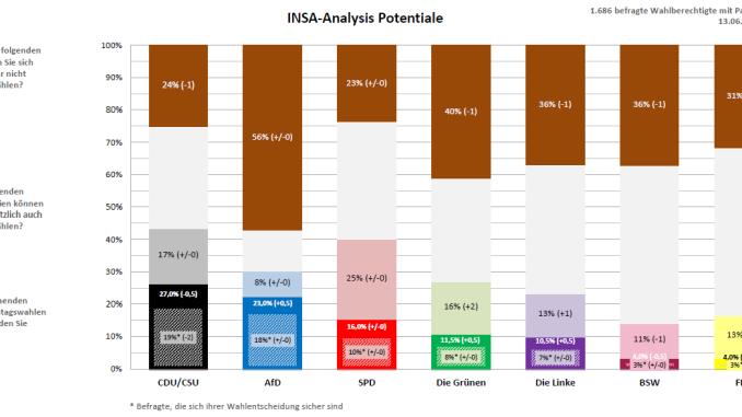 Sowohl die Linke als auch die FDP gewinnt bei den potentiell erreichbaren Wählern einen und die Grünen zwei Prozentpunkte hinzu, wohingegen das BSW hier einen Prozentpunkt einbüßt. Die Potentiale der Union, AfD sowie der SPD verändern sich nicht.