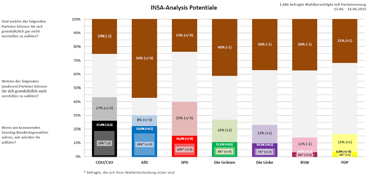 INSA-Sonntagsumfrage: Schwarz-Rot und Rot-Grün-Rot ohne Mehrheit INSA-Sonntagsumfrage: Schwarz-Rot und Rot-Grün-Rot ohne Mehrheit Drucken