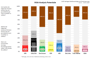 Den Anteil an potentiellen Wählern können die Grünen, die FDP sowie die Linkspartei jeweils um einen und die Freien Wähler um zwei Prozentpunkte erhöhen. Die Union sowie das BSW verlieren hier hingegen jeweils einen Prozentpunkt. Die Potentiale der beiden anderen Parteien bleiben jeweils konstant.