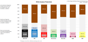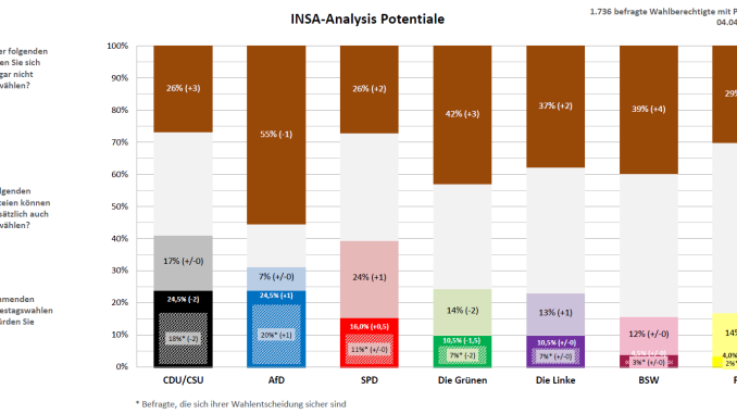 Bei den potentiell erreichbaren Wählern legt die SPD, die Linke sowie die FDP jeweils einen Prozentpunkt zu, wohingegen hier die Grünen zwei Prozentpunkte einbüßen. Die Potentiale der Union, der AfD sowie des BSW bleiben konstant.