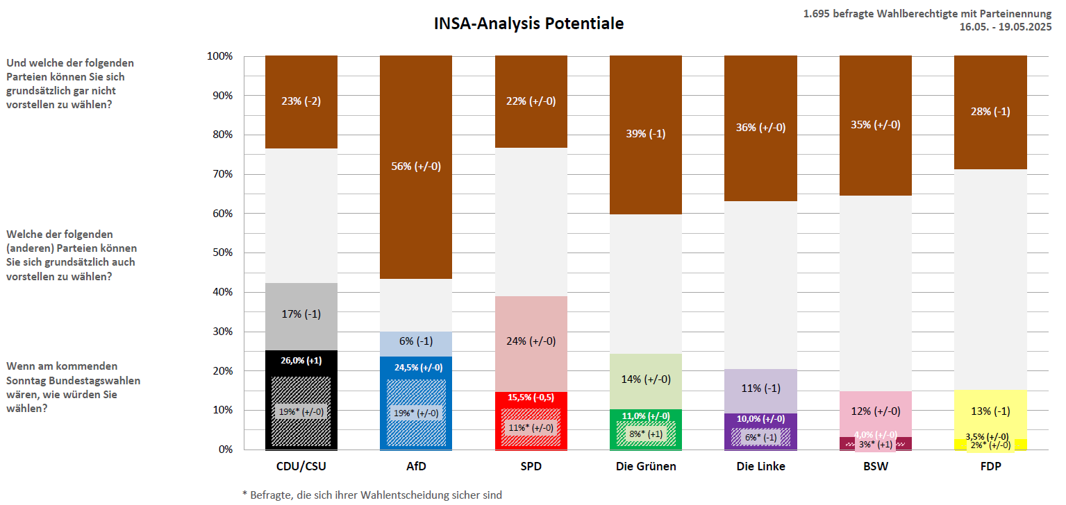 Die Union (26 %) legt in dieser Woche einen Prozentpunkt zu und führt somit nach wie vor die aktuelle Potentialanalyse vor der AfD mit 24,5 Prozent, deren Wert unverändert bleibt, an.