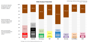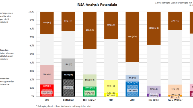 Den Anteil an potentiellen Wählern kann einzig die AfD um einen Prozentpunkt erhöhen, wohingegen die Linkspartei und die Freien Wähler hier jeweils einen, die Union zwei und die FDP drei Prozentpunkte verlieren. Die Potentiale der übrigen Parteien verändern sich jeweils nicht.