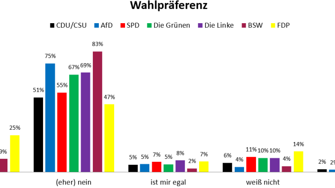 Über sämtliche Wählergruppen hinweg überwiegt jeweils zumindest relativ-mehrheitlich der Anteil derer, welche gegen Waffenlieferungen an Israel sind, wobei dies Wähler der AfD sowie des BSW öfter als der Rest so angeben (75 bzw. 83 zu 47 – 69 %). Unionswähler stimmen hier deutlich häufiger als die anderen zu (35 zu 9 – 25 %).