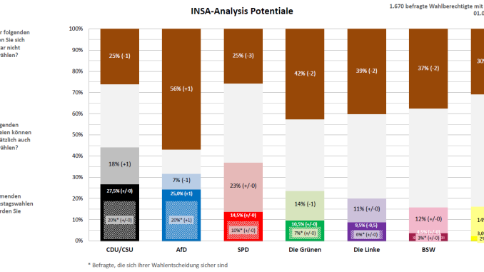 Bei den potentiell erreichbaren Wählern kann einzig die Union einen Prozentpunkt zulegen, während sowohl die AfD als auch die Grünen hier jeweils einen Punkt einbüßen. Die Potentiale der SPD, der Linkspartei, des BSW sowie der FDP verändern sich nicht.