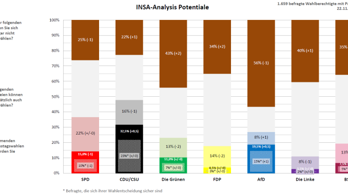 Der Anteil an ausschließenden Wählern können die SPD sowie die AfD um einen Prozentpunkt verringern, wohingegen sowohl die Union als auch die Linke diesen Anteil um einen und die Grünen sowie die FDP jeweils um zwei Prozentpunkte erhöhen. Einzig das Negativpotential des BSW verändert sich nicht.