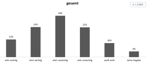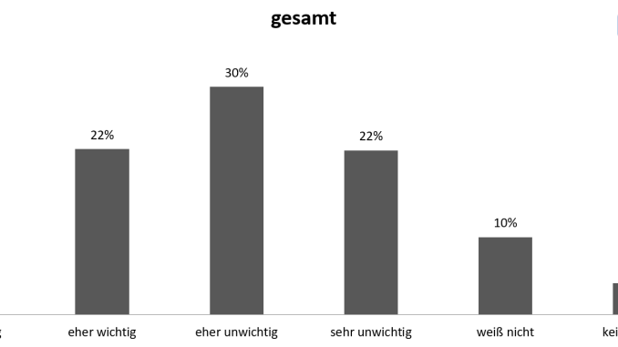 Die absolute Mehrheit von 53 Prozent (kumuliert) gibt an, dass es ihnen eher (30 %) oder sehr unwichtig (22 %) ist, dass eine Frau Bundespräsidentin wird. Für gut ein Drittel (35 %, kumuliert) ist es eher (22 %) oder sehr wichtig (13 %). Zehn Prozent wissen keine Antwort und vier Prozent geben keine.