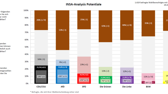 Bei den potentiell erreichbaren Wählern kann die SPD, die Linke sowie die FDP jeweils einen und die AfD zwei Prozentpunkte hinzugewinnen. Die Union verliert hier einen und die Grünen zwei Prozentpunkte. Einzig das Potential des BSW bleibt konstant.