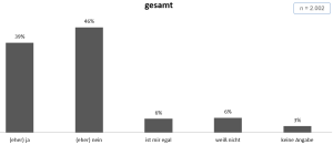 Auch wenn beide Bevölkerungsgruppen jeweils zumindest knapp relativ-mehrheitlich der Ansicht sind, dass die Ukraine nicht mit Waffenlieferungen durch Deutschland weiter unterstützt werden sollte, geben dies Befragte aus dem Osten absolut-mehrheitlich und somit öfter als jene aus dem Westen an, welche dies lediglich knapp relativ-mehrheitlich so befinden (53 zu 44 %). Sie bejahen hier entsprechend häufiger (41 zu 32 %).
